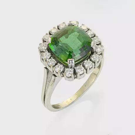 Weißgold, 18 k. Zentral besetzt mit einem apfel- bzw. petrolgrünen Turmalin von ca. 4,50 ct. im Treppenschliff, entouriert von Brillanten von zus. ca. 0,50 ct.; Gew. ca. 7,30 g.
