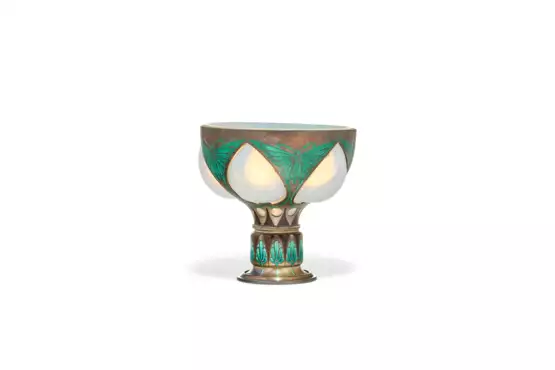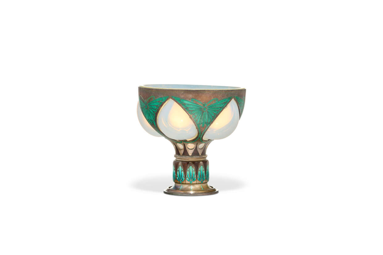 AN ENAMELLED AND PATINATED SILVER, OPALESCENT GLASS CHALICE BY EUGÈNE FEUILLÂTRE, CIRCA 1903