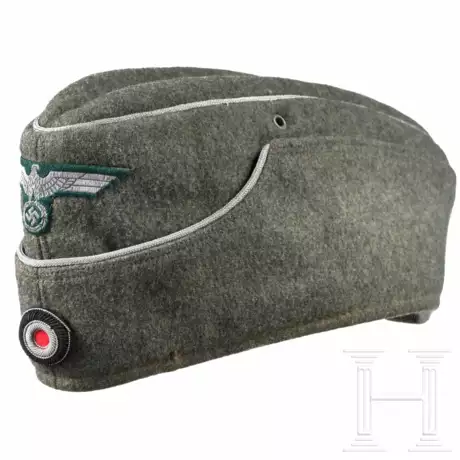 Feldgraues Tuch mit umlaufender silberner Paspelierung, komplett mit aus Metallfaden gewebtem Hoheitsadler und handgestickter Kokarde, Innenfutter und Schweißband, seitlich mit je einen Lüftungsloch. Eugen Fohrer diente als Leutnant der Reserve beim Lehr-Regiment "Brandenburg" z.b.V. 800. Leicht getragen.