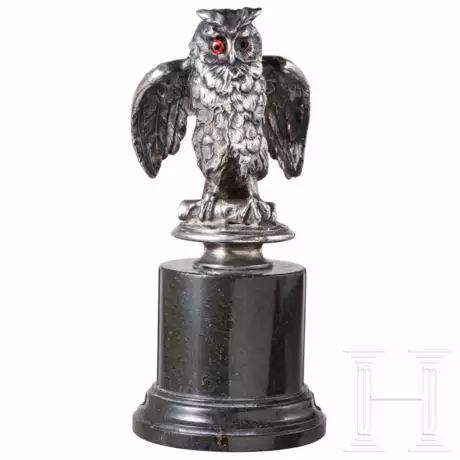 Versilbert. Vollplastisch gearbeitete, auf einem Ast stehende Eule mit ausgebreiteten Flügeln. Sehr dekorativ ausgearbeitetes Stück. Ein Auge mit Fehlstellen. Sockel mit kleinen Chip. Höhe Eule 7 cm, Höhe mit Sockel 11,5 cm.