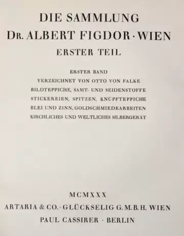 Inhalt des Versteigerungskataloges: I: O. v. Falke. Teppiche, Gold- u. Silberschmiedearbeiten etc.- II. Möbel. - III: M. J. Friedländer. Gemälde.- IV: L. Planiscig. Italienische Skulpturen etc. u. Th. Demmler. Deutsche, niederländische u. französische Skulpturen.- V: O. v. Falke u. L. Planiscig. Kästchen u. Schachteln, Bronzegeräte etc.