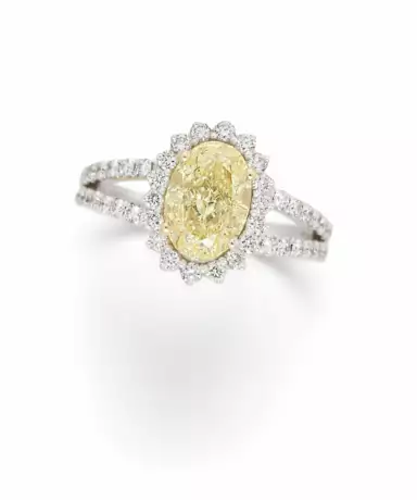 Diamonds: 1 oval brilliant-cut diamond ca. 2,0 ct., fancy yellow/VS2, 54 brilliant-cut diamonds in total ca. 0,5 ct. H/VS.