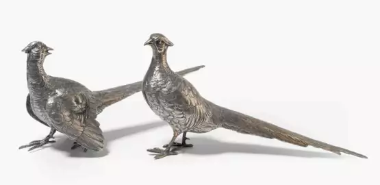 Versilbert. Vollplastische Darstellung zweier Fasanen. L 24 cm.