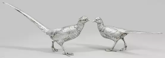 Silber. Naturalistische, vollplastische Ausarbeitung zweier Fasane mit reliefiertem Gefieder. Kopf abnehmbar. Minim. rest.; Gest. 800. Gew. zus. ca. 415 g. H. 10 cm - 15 cm.