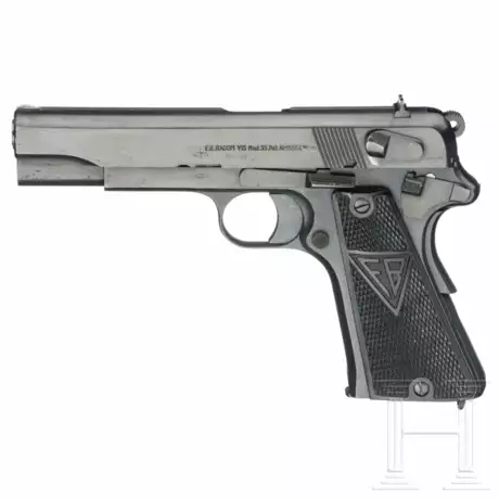 Cal. 9mmLuger, SN. C6641, nicht nummerngleich. Lauf matt. Achtschüssiges Magazin. Nicht gültiger deutscher Militärbeschuss. Nut für Anschlagschaft in der Nachkriegszeit angebracht. Korn weiß lackiert. Standardbeschriftung mit Zusatz "P.35(p)", div. Abnahmen Adler/"77" und Adler/"623". Waffe leicht abgeschliffen und neu brüniert. Schwarze Kunststoffgriffschalen mit feiner Fischhaut und Beschriftung "FB" (Fabriyka Broni (Radom), Reservemagazin ohne Abnahme. Braune, reine Verwahrtasche. Trotz Überarbeitung macht die Pistole einen brauchbaren Eindruck.