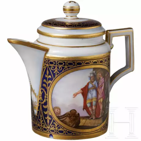 Porzellan, farbig bemalt und reich goldstaffiert. Kleine Milchkanne mit eckigem Henkel und aufwendigem Golddekor auf kobaltblauem Grund. Seitlich fein gemalte mythologische Szenen. Unterseite mit Zeptermarke. Am unteren Rand minimal bestoßen, ein Riss unten am Henkel und ein Haarriss am Ausguss. Höhe ca. 10 cm.