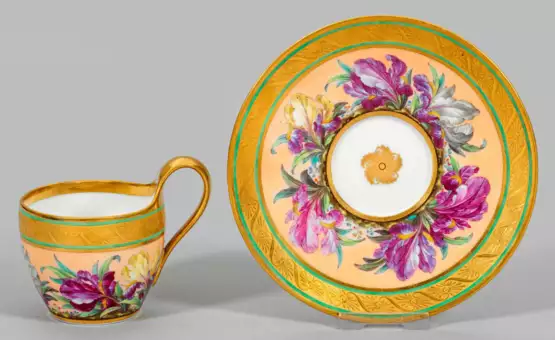 auf Untertasse. Campanerform mit hochgezogenem Schlaufenhenkel. Umlaufend der Wandung auf lachsfarbenem Fond farbenprächtige Lilienblüten "en terrasse". Oberhalb Palmettenbordüre mit Reliefgold und grüner Kontur. Feine polychrome Malerei mit reicher Goldstaffage. Minim. rest.; Zepter- und Malereimarke. Tassen-H. mit Henkel 7,5 cm. Untertassen-D. 14 cm.