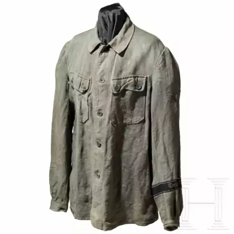 Ungefütterte Arbeitsbluse aus feldgrauen Drillich mit zwei Brusttaschen und vernähten Pappknöpfen. Innenseitig Reste des TeNo-Stempels, im Rücken ein vernähtes Herstelleretikett. Ärmeladler in Dreiecksform in Grau auf grün gewebter BeVo-Ausführung. Schwarzes Ärmelband in BeVo-Ausführung. Etwas verwaschen, seltene Bluse.