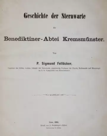 Erste Ausgabe, selten. - War zunächst als Aufsatz in einem Gymnasial-Programm bestimmt, die Schrift dehnte sich jedoch zu sechs Jahrgängen aus, die hier gesammelt erscheinen (aus dem 1869 dat. Vorwort). Fundgrube für die Geschichte der ersten hundert Jahre dieser Sternwarte. Enthält u.a. eine Darstellung des astronomischen Kabinetts aus der Zeit ihres ersten Astromoms Placidus Fixlmillner. - Tls. gering gebräunt.