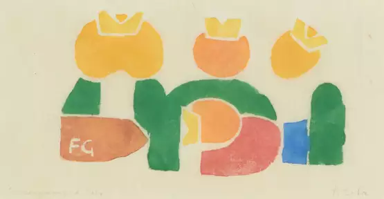 Sonnengesang. 1958. Farbholzschnitt. Unten rechts in Bleistift signiert. Unten links betitelt und bezeichnet: "8. Vers.". Blattgrösse 11x22,9 cm. Gerahmt.