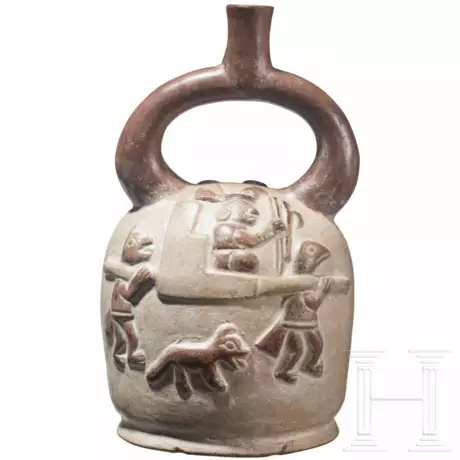 Ton, bemalt. Bauchiges Gefäß mit flacher Unterseite. Beidseitig identische reliefierte Darstellung eines Oberhauptes in Tiergestalt, das auf einer Barre von zwei Bediensteten getragen wird. Steinbügelausguss. Maße 22 x 12 x 11 cm. Die Altersbestimmung erfolgte aufgrund der Charakteristika des Objekts, ohne ein TL-Gutachten angefertigt zu haben.