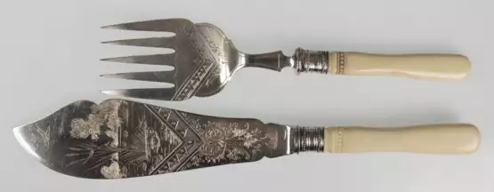 Lot 728 | Fischvorleger, versilbert, 1920 Jahre, reich floral reliefierte Laffen, L. 24,5 cm und 31 cm