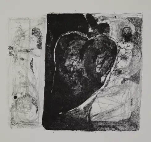 Künstlerbuch mit geteiltem Buchblock, von zwei Seiten zu lesen. Eines von 20 numer. Exemplaren (Gesamtauflage 20 + 5 röm. numer. Kassetten-Ausgaben). Handsatz und -druck von Peter Rensch.