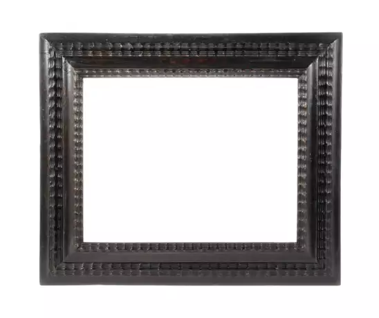 wohl um 1900, ca. 10 breiter, nach innen ansteigender Rahmen, gekehlt und mit profilierten Flammleisten verziert, auf Gehrung gesägt rückseitig verplattet, Altersspuren, Falzmaße 46 x 36 cm.