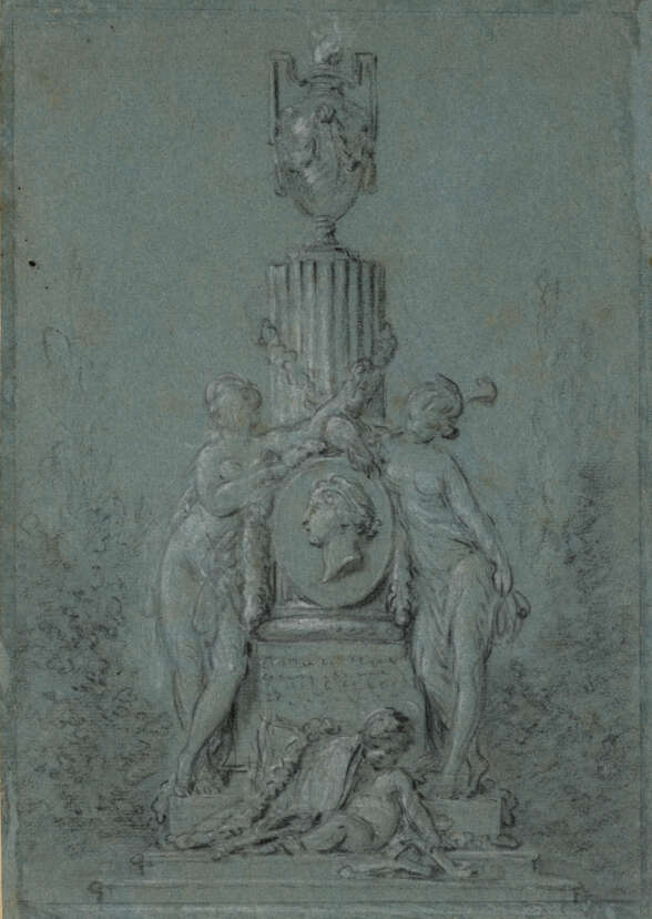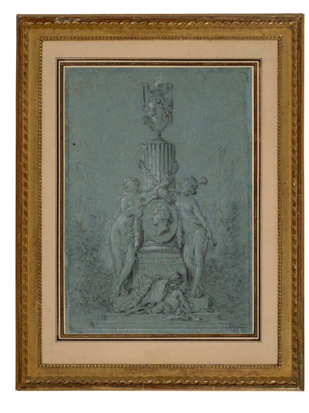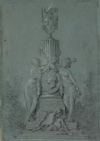This monument, drawn on blue paper, would have been created by François Boucher in honor of a certain Miss Dorothea Sandow in Berlin (according to P. Jean-Richard, op. cit.). The young woman is depicted here in profile in a medallion, supported by two nymphs, in the middle of a fluted column topped by a funeral urn. In the lower part, a seated cherub holds an open book, garlanded with roses. The print by Jean-Henri Eberts corresponding to the drawing is dedicated to Frédéric Ulrik, Baron de Friesendorff, secretary to the King of Sweden (fig. 1; J.-H. Eberts, after F. Boucher, Monument de Mademoiselle Sandow à Berlin, Paris, musée du Louvre, inv.18565).