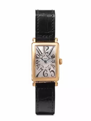 Ref. 900QZ. Bombiertes 750 Gelbgold-Gehäuse, Nr. 428, 40x23 mm. Quarzwerk, Versilbertes, guillochiertes Zifferblatt mit arabischen Zahlen und gebläuten Zeigern. Neuwertiges, originales Lederband mit Gelbgold-Dornschliesse. Funktionstüchtig.
