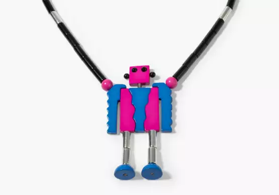 1980er. Aus schwarzem, rosafarbenem und blauem Galalith. Anhänger in Form eines Roboters. L 60 cm.