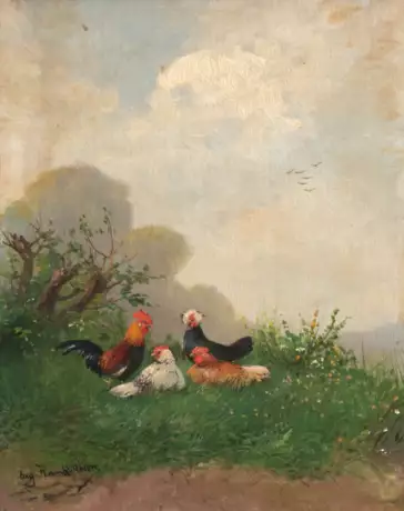Lot 142 | Frank-Colon, Eugen (Maler der Düsseldorfer Schule des 20. Jh.) "Hühner und Hahn", Öl/ Holz, sign. u.l., 27x20,5 cm, Rahmen