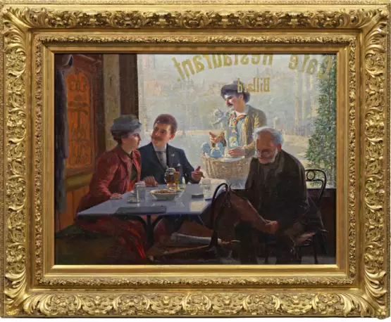 Im Stil des französischen Impressionismus flott gemaltes Genrebild, das Restaurantbesucher an einem Marmortisch und auf Thonetmöbeln sitzend, zeigt. Von draußen bietet ein Händler Porzellanfiguren feil. Im Hintergrund die Kirchtürme der Marienkirche und Platzfassaden in hellen Pastelltönen, die an Claude Monet erinnern. L. u. sign., dat. und bez. München (18)95. Öl/Lwd.; 66 cm x 86 cm. Rahmen.