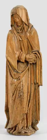 Walnussholz, Rückseite abgeflacht. In sich gekehrte Mutter Christi, den Tod Ihres Sohnes am Kreuz betrauernd. Polychrome Originalfassung größtenteils verloren. H. 62,5 cm.