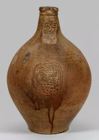Steinzeug mit brauner Salzglasur. Ovoide, gebauchte Form mit aufgelegtem Reliefdekor: am Hals eine stilisierte Bartmannmaske; schauseitig am Bauch ein Ovalmedaillon mit dem Kölner Stadtwappen, bekrönt von einem Reichsadler; an der Schulter zwei kleine Rosetten. Ger. best.; H. 38 cm.