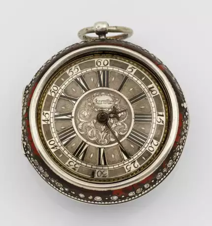 Silber. Übergehäuse mit flächendeckendem Fond aus Schildpatt sowie aufwändigem ornamental punziertem Dekor aus Volutenspangen. Rundes, glattes, verglastes Innengehäuse, gest. W47. Aufwändig reliefiertes, sog. Champlevé-Zifferblatt mit geschwärzten, römischen Zahlen und arabischer Minuterie, bez. Johann KornMan. Lanzenzeiger. Reich verziertes, vergoldetes Werk mit Spindelgang, Schnecke und Kette, durchbrochen gearbeiteten Pfeilern aus gegeneinander gestellten Voluten. Filigran ausgeschnittener Spindelkloben mit Maskaron sowie fein gravierten Blattvoluten und Vögeln. Platine bez. Johann KornMann. D. 5,4 cm. Ges.- Gew. ca. 118 g.