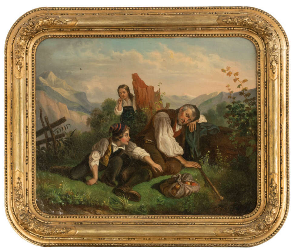 In the mountains, oil on canvas, 45 x 55 cm canvas dimensions, signed, craquelure, partially retouched, canvas restored, in need of cleaning