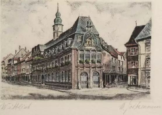 Lot 251 | Frikemann, H.? "Rathaus in Wittlich", Farbradierung, sign. u.r., 7,5x11 cm, hinter Glas und Rahmen