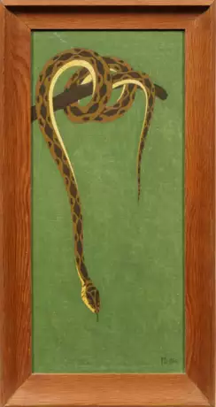 Eine schlanke Schlange mit auffälligem Kreuzmuster auf dem Rücken hat sich um einen Zweig gewickelt. Charakteristische, in der Komposition stark reduzierte Arbeit aus dem Spätwerk des Stuttgarter Malers und Holzschneiders. Lang besuchte nach einer Ausbildung zum Dekorationsmaler die Akademien in Stuttgart und Karlsruhe und richtete sein künstlerisches Augenmerk auf die Wiedergabe von Motiven aus der Tierwelt, die er mit großem Einfühlungsvermögen erfasste. Öl/Lwd., kaschiert auf Karton. R. u. monogr. und dat. 1960. Sichtmaß 42,8 cm x 18,5 cm. Rahmen.