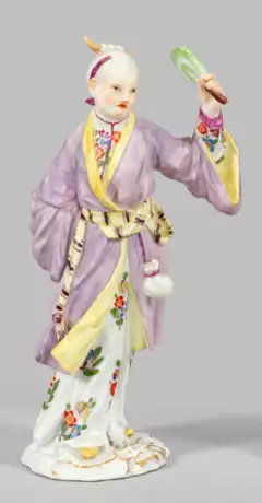 Auf rocaillereliefiertem Sockel stehende Japanerin, gewandet in einen langen Kimono mit blütengemustertem Rock, mit der Hand des erhobenen linken Arms einen Fächer wedelnd. Polychrome Malerei mit Goldstaffage. Entw. Johann Joachim Kaendler, 1759. Partiell best.; Rest.; Minim. Brandriss. Unglasierter Boden. H. 15,5 cm.