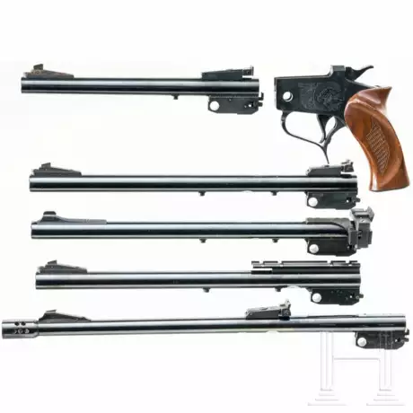 Cal. .222Rem, SN. BY-11081, blanker, Super 14"-Lauf mit offener Visierung. Wechsellauf Super 16" im Kal. .45-70 Gov. mit Mündungsbremse. Blanker Lauf, 16", im Kal. .32-40 mit montierter Weaver-Schiene. Blanker, Super14" Lauf im Kal. .45 Win Mag mit offener Visierung. Wechsellauf im Kal. .44 Rem Mag.. Dazu ein Griffstück mit Nussholzgriff mit Fischhaut. Der Verbindungsbolzen zwischen Lauf und Griffstück fehlt.