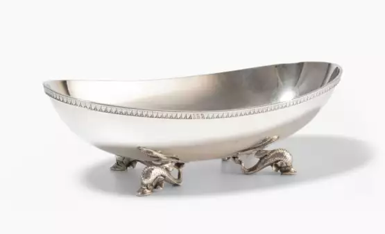Silber. Herstellermarke Koch & Bergfeld. Ovale gemuldete Form mit abschliessender Blattbordüre, auf Delfinfüssen. Halbmond/Krone, Herstellermarke, Feingehalt 925. 33x17 cm, ca. 960 g.