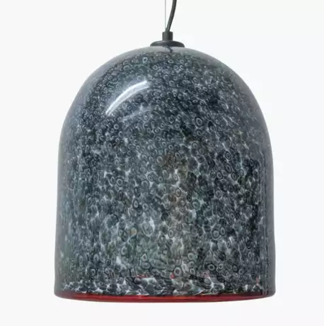 Entwurf um 1970 für Vetreria Vistosi, Murano. Farbloses Glas mit Murrineneinschmelzungen in Blau und Rot. Rand mit roter Fadenaufschmelzung. Verchromte Aufhängung. Am Schirm signiert "VISTOSI" (graviert). D 30,5 cm. H 35 cm.