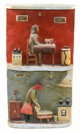 (polnisch, 20. Jh.). Interieur mit zwei Personen. Holz, halbplastisch geschnitzt, polychrom gefasst. 48 x 26,5 x 8 cm. Rücks. sign. - Angestaubt.