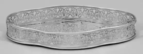 Silber. Vierpassig geschweifte, glatte Bodenplatte, umzogen von volutiert durchbrochen gearbeitetem Rand. An den Schmalseiten kleine Griffmulden. Minim. Dellen. Gest. 925, Herstellerzeichen. Gew. ca. 500 g. 31 cm x 20 cm.