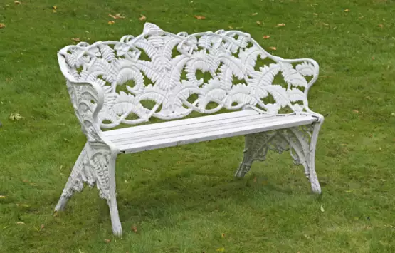 Metall und Holz, weiß lackiert. Geschwungener, durchbrochen gearbeiteter Korpus aus üppigen Farnblättern mit schlanken, vegetabil gestalteten Beinen. Sitzfläche aus schmalen, gekanteten Stegen. H. 88 cm. 142 cm x 50 cm. Sitz-H. 42 cm.
