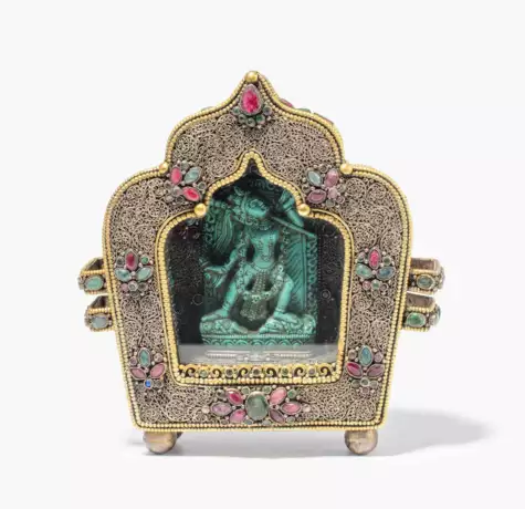 Tibet, 20.Jh. Reisenschrein aus Silberfiligran und Messing, besetzt mit Turmalin. Giebelförmiger Gau mit entsprechend geformtem Sichtfenster. Darin aus Türkis geschnitzte Dakini mit Schädelkette. H 15 cm.