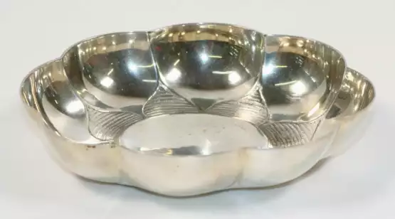 Blütenschale in 800 Silber. 8-passige Schale mit stilisierten Blüten. 12 x 10 cm. Gew. 90,5 g.