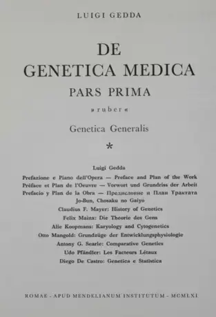 Eines der Hauptwerke des italienischen Genetikers Luigi Gedda (1902-2000), zugleich medizinischer Berater des Papstes Pius XII. und Führer der kathol. Aktivisten in Italien. - Das Werk war ursprünglich auf 7 Bände geplant. - Die Untertitel der Bände: I. Genetica generalis; II. Genetica humana normalis; III. Geneticae medicae principia; IV. Genetica de morbis generalibus; - VI. Genetica de morbis oculorum; genetica de morbis mentis. - Vorsatz von Band I mit schöner Verfasserwidmung an den Mitarbeiter des Handbuches, Prof. Dr. U. Schaefer, dat. Rom 1962. - ╔Dabei: 3 Standardwerke zur Genetik: 1.╗ Dorfman,A. (Editor). Antenatal diagnosis. NICHD - Mental Retardation Research Centers Series. Mit zahlr. Illustrationen. Chicago und London, The University of Chicago Press 1972. Gr.8°. XII, 286 S. Olwd. - ╔2.╗ McKusick,V.A. Heritable disorders of connective tissue. Fourth edition. St.Louis, Mosby 1972. Gr.8°. Mit 1099 Illustr. und 2 farb. Tafeln. XV, 878 S. Olwd. - Der amerikanische Humangenetiker McKusick (1921-2008) gilt als Mitbegründer der medizinischen Genetik als eigenständiges Fachgebiet. - ╔3.╗ Grouchy,J.de u. C.Turleau. Atlas des maladies chromosomiques. Paris, Expansion Scientifique Francaise 1977. Gr.4°. Reich illustriert. 2 Bl., 355 S. Olwd. - Erste Ausgabe. - "Fortunately, he wrote, in association with Catherine Turleau, an excellent atlas of chromosome aberrations, which remains a must in this field" (www.biologia.uniba.it). - Gutes Exemplar.