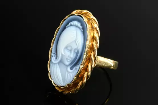 750 yellow gold ring with modern layered agate cameo ‘Woman looking down’ in cord setting, engraved ‘Venus Y’ on the reverse, 8.4g, size 54