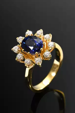 750 yellow gold ring with sapphire doublet (1.91 ct) in brilliant-cut bezel setting (total approx. 0.51 ct/VVS/W), 6.4 g, size 56