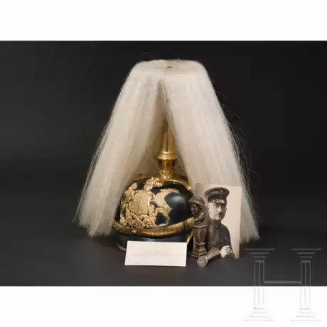 Leather skull lacquered in black (craquelures in some parts) with angular front visor (traces of heat) and gilt brass fittings. Screw-mounted emblem in the shape of the crowned Württemberg coat of arms. Cruciform base plate with four star screws, rear rail, bead-and-reel frieze and smooth, high holder with white buffalo hair plume and fluted cover plate. Convex, leather-backed chinscales on geometric rosettes with both cockades of lacquered sheet metal. Cream-coloured lining of ribbed silk and leather sweatband of matching colour, visors backed in red and green, inside the skull the old size indication "54". Beautifully preserved officer’s helmet, directly from the estate.