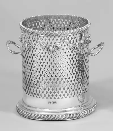 Sterlingsilber. Auf rundem, profilierten Stand zylindrischer Korpus mit gitterförmig durchbrochen gearbeiteter Wandung, Kordelbandrändern und umlaufend reliefierten Blütenfestons. Gegenständige, ringförmige Handhaben. Gest. Beschaumarken, Herstellerzeichen, Jahresbuchstabe "q". Gew. ca. 568 g. H. 15 cm.
