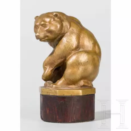 Aus Messing gegossene, fein nachbearbeitete Figur eines halb sitzenden Braunbärs. Auf der oktagonalen Plinthe Marke "GUSS BARTH" sowie Signatur "S [...?]liepstein". Stellenweise ganz leicht bestoßen. Aufgestellt auf schlichten Sockel aus lackiertem Holz. Höhe 13,5 cm.