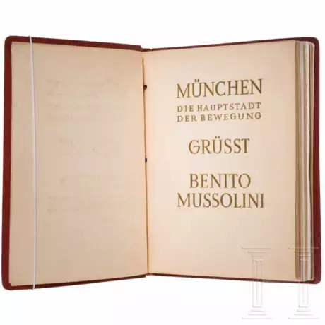 Roter Ledereinband (sichtlich bestoßen) mit goldgeprägtem Adler. Auf dem Vorsatzblatt goldgeprägt "München die Hauptstadt der Bewegung grüßt Benito Mussolini". Deutscher und italienischer Text, mit Fotografien und farbigen Zeichnungen, Lederbindung.