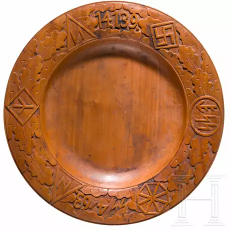 Holzteller, die Fahne mit geschnitztem und reliefiertem Dekor im Design des Ringes mit den Runen zwischen Eichenlaubdekor, Datum "14.1.39" und Einheit "SS 4/63" (63. SS-Standarte Tübingen). Durchmesser 27 cm.