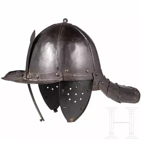 Einteilig geschlagene Kalotte mit sechs schmalen Rippen und vernieteter Scheitelplatte mit Hängeöse. Spitz zulaufender, vernieteter Augenschirm (rechts neben dem Nasal eingerissen) mit gebördeltem Rand und verstellbarem Nasal. An der Spitze geschlagene undeutliche Marke. Anhängende Wangenklappen (Belederung erneuert) mit je neun Gehörlochungen. Dreifach geschobener, spitz zulaufender Nackenschirm mit einer Hängelochung. Auf dem untersten Geschübe geschlagene Markierung "A". Höhe 28, cm. Identische Zischäggen befinden sich heute noch in großer Zahl in der Sammlung des Landeszeughauses in Graz.