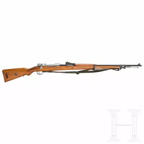 Kal. 8x57JS, Nr. 5401n , nummerngleich inkl. Schrauben. Blanker Lauf. Fünfschüssig. Hülsenkopf gemarkt Krone/"Amberg/1917", div. kaiserliche Abnahmen. Gute originale Brünierung. Schloss und Hülse blank. Nummerngleicher Buchenschaft mit tiefen Stempeln, geringe Trage- und Lagerspuren. Rechts im Kolben Brandstempel "EWB". In der Schaftkappe ein paar kleine Närbchen. Komplett mit Beriemung, Mündungsschutz und Putzstock. Fast neuwertige Erhaltung, sehr schöne Sammlerwaffe. Länge 125 cm.