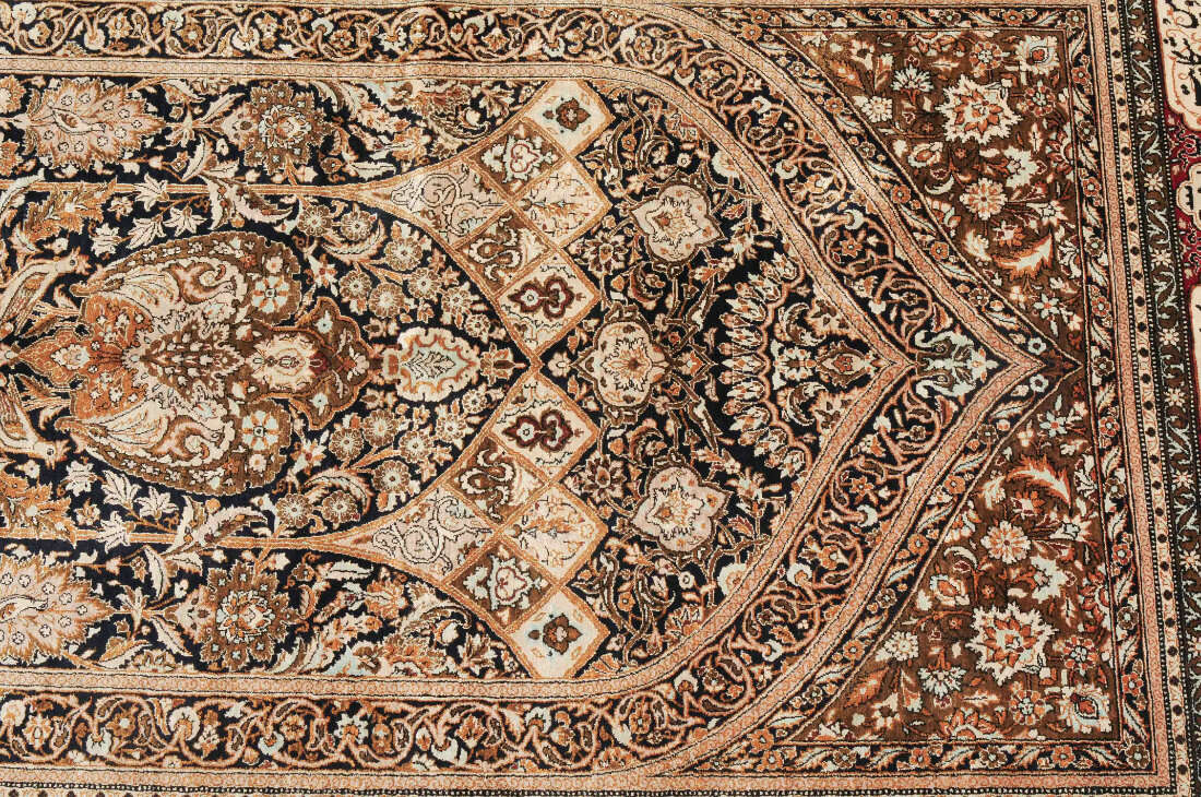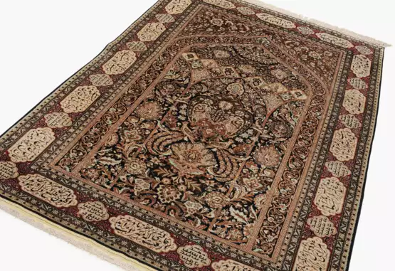 Z-Persien, um 1970. Flormaterial und Kette reine Seide. Unter einem mosaikartigen Baldachin, von dem eine Ampel hinab ins Feld ragt, erscheinen auf tiefblauem Grund elegant platzierte Blütenpalmetten, florale Rankenbänder und Vögel. Filigrane Rosettenborten säumen die rote Hauptbordüre, die mit Wolkenbändern und weissen Gedichts-Kartuschen geschmückt ist und einen aparten Rahmen bildet. Gute Erhaltung. 140x213 cm (ft. 4.6x7).