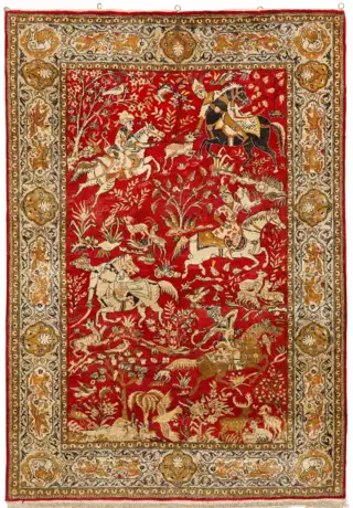 Persien. Seide auf Seide. Im hellroten Innenfeld flächendeckende szenisch angelegte Musterung aus berittenen Jägern und unterschiedlichen Wildtieren. Umlaufend elfenbeinfarbene Kartuschenbordüre mit korrespondierender Musterung. 153 cm x 105 cm.